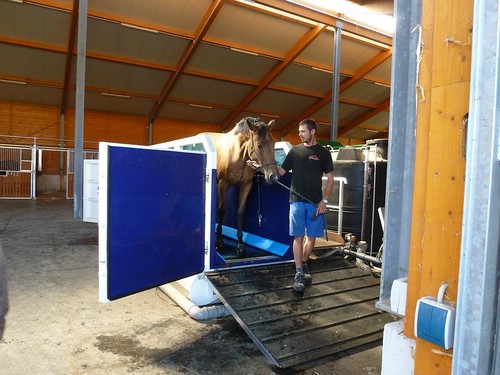 Der anschließende Besuch von Horse - Gym 2000 in Großsorheim, eines Herstellers für Laufbänder, wahlweise für Pferd oder Hund, war sehr informativ. Die Laufbänder werden für jede Pferdesportart speziell gefertigt. Dr. Nowottny prüfte höchstselbst auf dem Band die Wirksamkeit und stellte an sich, trotz kurzer Zeit, bereits Erfolge fest.